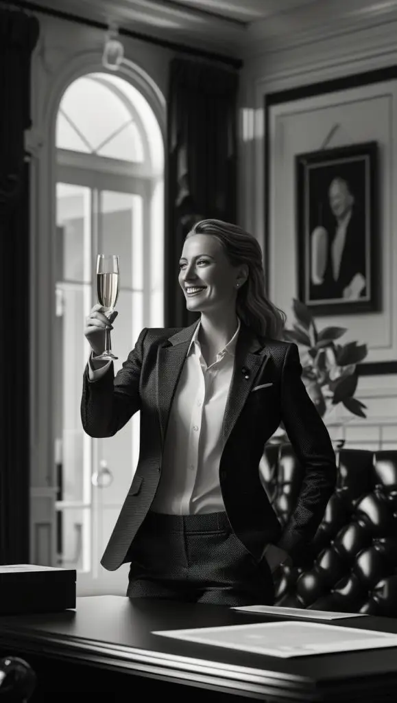 A cinematic black and white editorial photograph of a real estate agent in Mallorca preparing LinkedIn posts on a sleek laptop, elegant office setting, dramatic lighting, highly detailed, full texture, 8k resolution. (